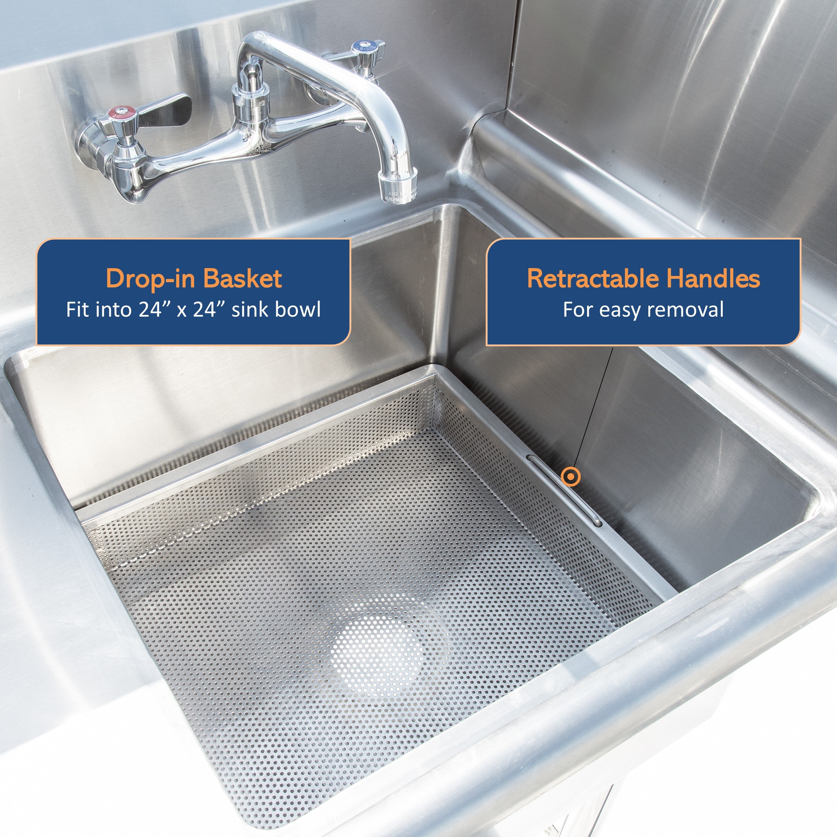 - [Retractable Handles] - Built-in sliding retractable handles for easy removal out of the sink.