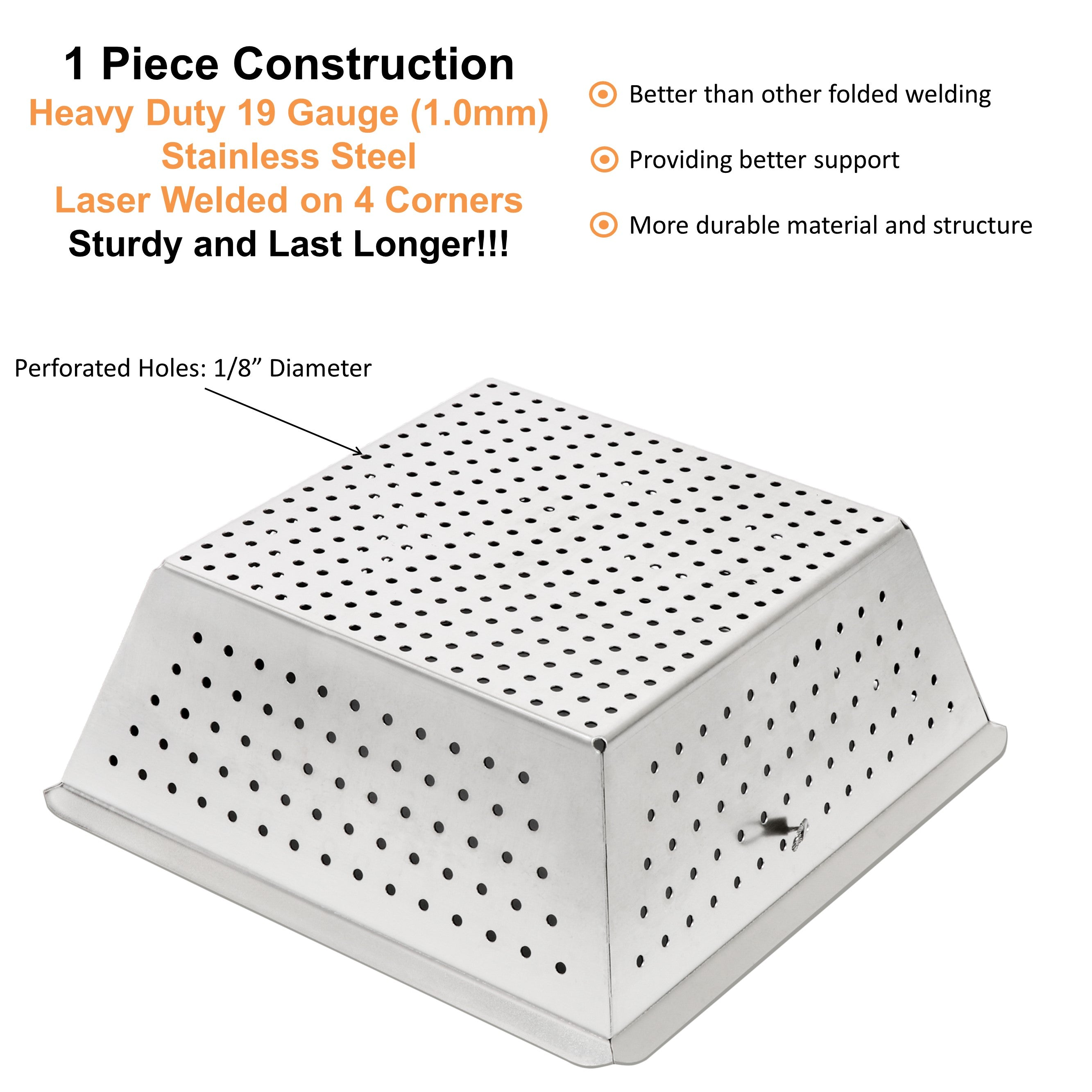 - [Dimensions and Weight] - Perforate diameter: 1/8”. Overall dimensions: 10”W x 10”D x 4-3/4”H, Bottom dimensions: 7"W x 7"D (Refer to the pictures for detailed dimensions). Net weight: 2.2 lbs.